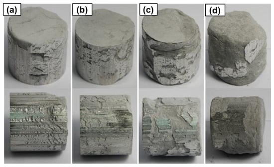 Subsequently to the pressing process, four aluminum–graphene composites with varying graphene content were obtained. For comparison purposes, a reference sample of pure aluminum was also produced. The compacts produced after the pressing process had a diameter of approximately 40 mm and a height of approximately 40 mm. The quality of their surfaces varied, as illustrated in the images included in Figure 18. The quality analysis of these compacts revealed that the compact with the highest graphene content in the aluminum matrix exhibited the greatest brittleness.