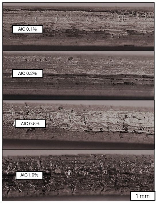 Within the extrusion process using the rotating die, five materials were obtained which were characterized by different carbon material content. The surface quality of the resulting compounds in the form of 4 mm diameter rods is presented in Figure 19. Through visual analysis of the surface quality of the extruded rods, it is evident that with an increase in the amount of carbon material, the final composite exhibits a nonuniform, scale-like surface, which is significant for subsequent plastic processing operations.