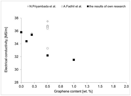 The results of the electrical conductivity of the Al-graphene composites obtained in this work against the results presented in the literature [20,30].