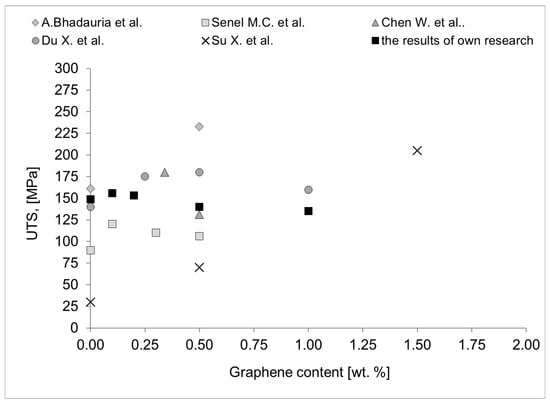 It can be observed that the carbon material content in the composites generally ranged up to 5 wt.%. At the same time, it is noticeable that composites with graphene content not exceeding 1% by weight are the most popular among researchers [10,11,12,13,14,15,16,22]. The highest tensile strength value (440 MPa) and elongation (5.5 wt.%) were achieved in the case of the composites produced by Shin and colleagues [16]. These composites were manufactured using powder metallurgy technology, high-energy ball milling, and then densification by hot rolling at a temperature of 500 °C. The FLG content in the composite with the highest tensile strength was 0.3–0.5 wt.%. The addition of carbon material allowed the researchers to obtain a composite whose tensile strength, relative to the strength of the aluminum matrix alone, increased by almost 70%, with a recorded decrease in elongation from 13% to 5.5%, representing a reduction of about 60% [19,23,24,25,26,27].