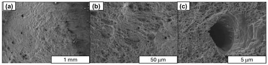 SEM images of the pure aluminum rod fracture surface after uniaxial tensile testing; magnification: (a) ×100 SE, (b) ×200 SE, (c) ×1000 SE.