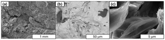 SEM images of the surface of the Al-FLG (1 wt.%); magnification: (a) ×50, SE, (b) ×1000 PDBSE, (c) ×10,000 SE.