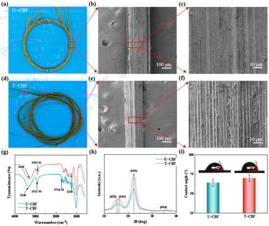 Figure 2 presents the morphology and microstructure of the bamboo fibers before and after alkali treatments. Figure 2a is the digital image of U-CBF, showing light yellow due to the existence of the lignin, hemicellulose, and other components. The SEM images in Figure 2b,c show the diameter is around 240 μm, and the surface is rough. Figure 2d presents the digital image of T-CBF, showing dark yellow due to the alkali treatment. The SEM image in Figure 2e reveals that the diameter of T-CBF decreased to 200 μm. Figure S2 presents the diameter changes of CBF with different diameters before and after the alkali treatment, revealing that the diameter reduction was approximately 18% compared to U-CBF. The enlarged SEM image in Figure 2f presents that the surface of the T-CBF is rougher, indicating more contact area with thermoplastics. Furthermore, Figure S3 presents the surface of bamboo fibers before and after the alkali treatment using the ultra-depth of field microscope. The quantitative results in Figure S4 show that the surface roughness of CBF increased from 6.98 μm to 11.01 μm after the alkali treatment. Both results demonstrate that the alkali treatment removed other components and exposed cellulose macrofibre bundles [], which increased the roughness of the CBF, consistent with previous reports [,]. The exposed microfibers are aligned along the longitude direction, indicating a strong continuous reinforced effect. Fourier-transform infrared spectroscopy (FT-IR) was carried out to further confirm the compositional changes of the bamboo fibers after alkali treatment. As shown in Figure 2e, the peaks located at 1734 cm−1 are assigned to the functional groups of hemicelluloses (C=O stretching vibration), and the peaks locating at 1250 cm−1 are assigned to the functional groups of lignin (Guaiacyl-lignin and C=O stretching vibration). These results indicate significant removal of the two components after the alkali treatment, which is consistent with previous reports []. XRD results in Figure 2h reveal that the crystal peak position does not change, demonstrating that no phase transformation occurred during the alkali treatment. The crystal intensity increased and the width decreased, showing an improved cellulose crystallinity according to the Scherrer method []. This increased crystallinity indicates improved mechanical and thermal properties of T-CBF. Figure 2i shows the contact angles of U-CBF and T-CBF were 62° to 76°, separately. This could be attributed to the changes of the surface roughness and the polarity of the hydroxyl group after alkali treatments. The lignin would react with strong alkali due to the existing phenolic hydroxyl group and carboxyl and was removed after washing. The removed lignin reduces the polarity of hydroxyl groups of the whole fibers, resulting in the increase in the water contact angle. This increased contact angle indicates enhanced hydrophobic–hydrophobic interactions of bamboo fibers with plastics. The above characterizations demonstrate that bamboo fibers could serve as a strong reinforcement due to higher crystallinity and improved plastic–fiber interface.