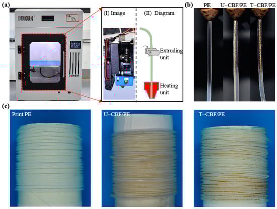 Figure 4a shows the digital image of the printing setup, where the outer plastics would first melt and then get impregnated into the fiber surface under the extruding unit and heating unit, as shown in the enlarged inset. To ensure the smooth extrusion of the material, a nozzle with a diameter of 0.8 mm and suitable printing parameters were selected. The heating temperature was 180 °C to form bamboo fiber-reinforced PE (noted as CBF/PE) composite material. Figure 4b exhibits the printed composite fibers through the printer, which shows that all the fibers, pure PE, U-CBF/PE, and T-CBF/PE, could print smoothly at suitable processing windows. Figure 4c shows the melting temperature of printed PE, U-CBF/PE, and T-CBF/PE composite fibers, demonstrating this method could fabricate the fibers in a large scale.
