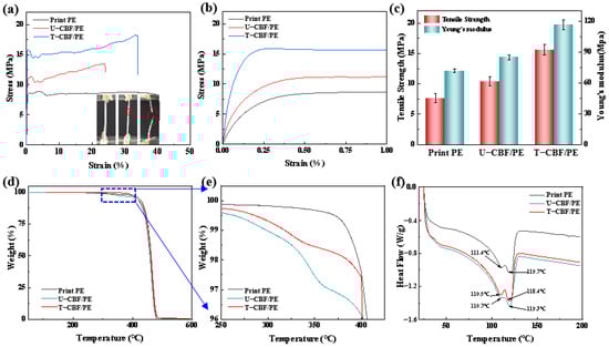 Performance of the composite fibers. (a) The stress–strain curves of fibers, inset: the images of the T-CBF/PE during tests. The red circles note the necking and fracture behaviour of composite fibers during testing; (b) the enlarged figure in (a); (c) the tensile strength, strain, and toughness of the composite fibers; (d) the TG curves of the composite fibers; (e) the enlarged figure in (d); (f) the DSC curves of the composite fibers.