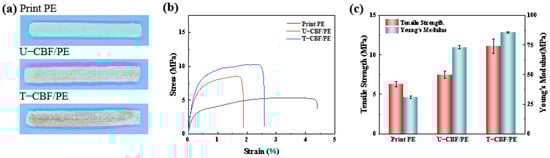 The mechanical properties of printed PE, U-CBF/PE, and T-CBF/PE filaments.