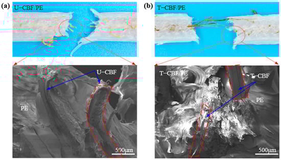 Furthermore, the morphology of the fracture section is presented in Figure 8. Figure 8a shows fewer fibers occur at the cross-section when the composite bulks were prepared by U-CBF/PE fracture according to the digital image. The corresponding SEM image shows (1) U-CBF are pulled out in the whole with little residual fibers; (2) the interface between U-CBF and PE is smooth. Both indicate the load is less transferred to the fibers. Figure 8b shows that more stretched fibers occur at the cross-section for the composite bulks prepared by T-CBF/PE from digital images. The corresponding SEM image shows that the interface between T-CBF and PE is vague, and a small portion of the expenditure fibers noted by the arrows are pulled out or buried in PE, which means the fiber–matrix interface could better transfer load. The above analysis demonstrates this strong adhesion is conducive to the continuous reinforcement effect on the PE material.