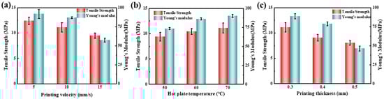 The mechanical performance of the bulks printed using T-CBF/PE composite fibers under different printing parameters. (a) Velocity, (b) temperature, and (c) thickness.