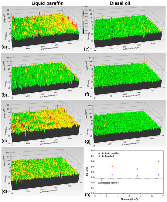 Optical profilometer 3-D images of Ti targets after laser processing in liquid paraffin (a–c), and diesel oil (e–g). The laser fluence applied during the ablation process was 6.5 J/cm2 (a,e), 8.7 J/cm2 (b,f), and 10.6 J/cm2 (c,g). The profile of the native Ti target before laser processing is shown in (d). The dependence of the roughness parameter Sa of the coatings on the applied laser fluence is presented in (h).