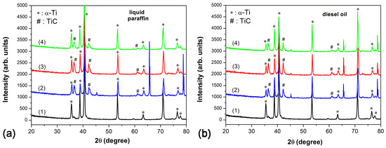 XRD patterns of Ti target surfaces before and after laser irradiation in liquid paraffin (a) and diesel oil (b) at different laser fluences (F): (1) without laser processing, (2) F = 6.5 J/cm2, (3) F = 8.7 J/cm2, and (4) F = 10.6 J/cm2.