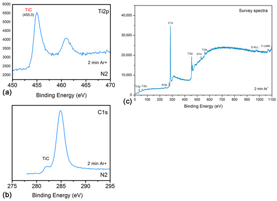 Additional analyses of the composition and electronic structure of the coatings obtained were carried out by X-ray photoelectron spectroscopy (XPS). Since the results of the XRD analysis did not show a significant difference in the composition of the coatings obtained by laser processing in liquid paraffin and diesel oil, we continued further research for the case of laser processing in liquid paraffin only. In order to remove surface contamination resulting from exposure to air before placing the sample into the XPS system, the coatings were Ar+ ion etched. Figure 6 shows the XPS spectra of a Ti surface laser irradiated by a fluence of 8.7 J/cm2 in liquid paraffin. The two peaks in Figure 6a centered around 455 eV and 461 eV correspond respectively to the main line (Ti2p3/2) and second line (Ti2p1/2) of Ti in TiC [28]. On the other hand, two peaks at 282.1 eV and 284.9 eV are observed in the C1s spectrum (Figure 6b). Typically, the carbon line in TiC is located around 281.5–282.5 eV. This is a characteristic of carbon bonded to a metal (carbide compounds). The presence of a peak around 284.9 eV in the C1s spectrum is due to adsorbed adventitious hydrocarbons.