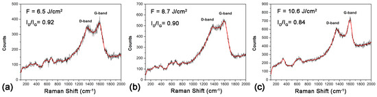 Measurements of the Raman scattering spectra of the laser-processed samples were carried out in order to thoroughly study the microstructure of the coatings obtained. Figure 7 presents the Raman spectra of the samples obtained by laser processing in liquid paraffin using three laser fluences—6.5 J/cm2 (a), 8.7 J/cm2 (b), and 10.6 J/cm2 (c). In all three Raman spectra, one can see two broad, intense peaks centered around 1590 cm−1 and 1360 cm−1 corresponding to the G-band and D-band, respectively, indicating the presence of free carbon phases in the coatings [12]. The G-band arises from the E2g vibrational mode, which involves the in-plane stretching motion of sp2-bonded carbon atoms. This mode is a signature of a crystalline-graphitic structure and an indicator of the presence of ordered graphitic domains. In turn, the D-band, or defect band, is activated by a process called double-resonance Raman scattering. It involves defects or disorder in the carbon lattice, such as edges, vacancies, or functional groups that break the perfect symmetry of the sp2-hybridized network. The ratio of the D-band-to-G-band intensity (ID/IG) is indicative of the ratio of amorphous carbon to the ordered graphite. Observing Figure 7, it can be concluded that by increasing the laser fluence, the ratio ID/IG decreases, pointing to an increase in the portion of the ordered graphitic phase relative to that of amorphous carbon in the resulting coating.