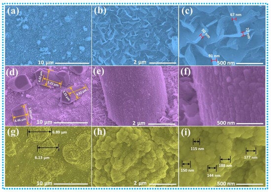 (a–i) High and low-magnification FESEM images of (a–c) CoMn-LDH, (d–f) CoMn@CuZnS, and (g–i) CoMn@CuZnFeS samples.