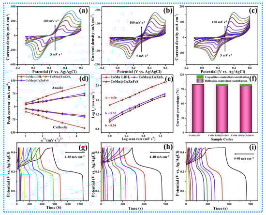 (a–c) CV, (d) ip vs. v1/2, (e) log (i) vs. log (υ), and (f) ratios of diffusion and capacitive contribution and (g–i) GCD curves of CoMn-LDH, CoMn@CuZnS, and CoMn@CuZnFeS heterostructures.