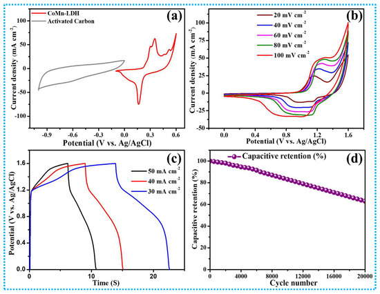 The feasibility of the as-deposited CoMn-LDH electrodes for practical use was assessed by fabricating an HSC device. The HSC device was then tested by employing the anode (a high-power-density AC electrode) and cathode (a high-energy-density CoMn-LDH electrode) in 4 M KOH in a pouch cell configuration. In an HSC device, the operating voltage range should be greater than that of each electrode. Therefore, the potential range of the HSC was determined as the sum of the working voltages of the anode (0–1 V) and cathode (−0.1–0.6 V) at a sweep rate of 5 mV s−1 (Figure 5a). CV plots were obtained at operating voltages in the range of 1–1.6 V at 100 mV s−1, as displayed in Figure S2a, to determine the optimal potential. It was found that the CV plot at 1.6 V showed a higher area under the curve and had the correct potential window of the HSC device. The CV plots of the HSC device showed distinct redox peaks that signified promising rate capability and interfacial kinetics (Figure 5b). Similarly, the behavior of GCD plots was also assessed under different potential windows (Figure S2b). The GCD plots indicated a high-rate capacity and superior energy storage performance (Figure 5c). The calculated CA values were found to be 781.25, 846.25, and 853.12 mF cm−2 for 50, 40, and 30 mA cm−2, respectively (Table 1). The CA value of 853.12 mF cm−2 (Cs of 293.90 F g−1) attained for the AC//CoMn-LDH HSC device surpassed the capacity reported by HSC based on similar materials, namely CoMn-LDH//AC (23.5 F/g at 1 A/g) [24], Co-Mn LDH (65 F g−1 at 0.5 A g−1) [25], and CoMn-LDH/CFP (53.5 F g−1 at 0.5 A g−1) [55]. The developed HSC had a high PD of 250 W cm−2 at an ED of 0.347 Wh cm−2 and a noteworthy ED of 0.379 Wh cm−2 (130.62 Wh kg−1) at a PD of 150 W cm−2 (Table 1). The performance of this CoMn-LDH-based HSC approached or surpassed that of most previously reported HSCs, including CoMn-LDH (20.3 Wh kg−1 at 425 W kg−1) [25], CoMn-LDH//AC (362.3 W kg−1 at 34.5 Wh kg−1) [26], Co0.2Ni0.8LDH//AC (748.6 W kg−1 at 34.5 Wh kg−1) [56], NiCo LDH//AC (150 W kg−1 at 36.2 Wh kg−1) [57], CoFe LDH/LPG//AC (2800 W kg−1 at 25.7 Wh kg−1) [58], and NiCo-LDH@PANI@CC//AC (728 W kg−1 at 26.5 Wh kg−1) [59]. Capacitive retention of 63% was observed at 50 mA cm−2 for 20,000 GCD cycles (Figure 5d).
