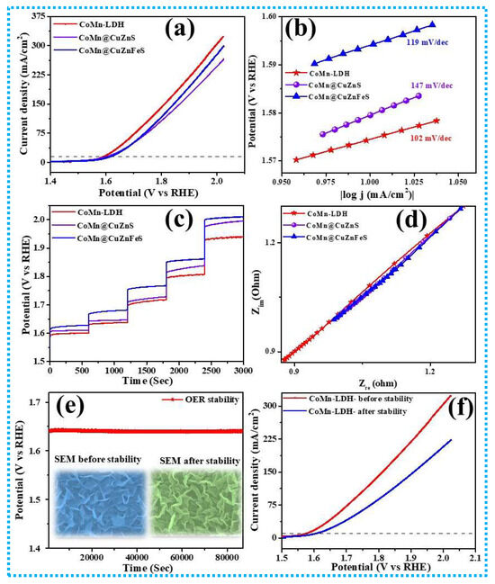 The catalytic process of all the electrodes was verified with a 1 M KOH electrolyte at 5 mV s−1 via a three-electrode setup. Figure 6a displays the polarization curve of all samples, providing further evidence that CoMn-LDH showed better OER performance. The CoMn-LDH electrode achieved a 370 mA cm−2 of current density (j) and required a low overpotential of 340 mV to attain j = 10 mA cm−2. The excellent OER activity of the CoMn-LH electrode can be credited to the ultralow thickness of the flex-type networks of nanosheets and the intrinsic layered structure. The heterostructures obtained comparatively low (j) of 299 and 267 mA cm−2 and request overpotentials of 350 and 366 mV, respectively. Interestingly, the nanogranular-type CoMn@CuZnFeS showed more encouraging catalytic activity than CoMn@CuZnS, which may be due to the introduction of Fe atoms [62]. However, overall, the inadequate performance of the heterostructured composites compared to the CoMn-LDH sample may be ascribed to the decreased porosity, which significantly reduced the active area, hindering the reaction kinetics and electron transport rate during HER activity. Generally, the CoMn-LDH-based OER catalysts showed moderately high potentials (η > 300 mV), indicating improved electrocatalytic OER activity. However, industrial applications demand achievement ≤ 100 mA cm−2 of a j at an overpotential of ≤350 mV, which remains challenging [2]. Notably, Table S5 reveals that CoMn-LDH showed comparable OER activity (340 mV) to achieve j = 10 mA cm−2 as previous reports for CoMn-LDH (300 mV) [63], Co5Mn-LDH/MWCNT (~300 mV) [64], Co3O4 nanomeshes (307 mV) [65], and CoMn-LDH/CNT (355 mV) [66].