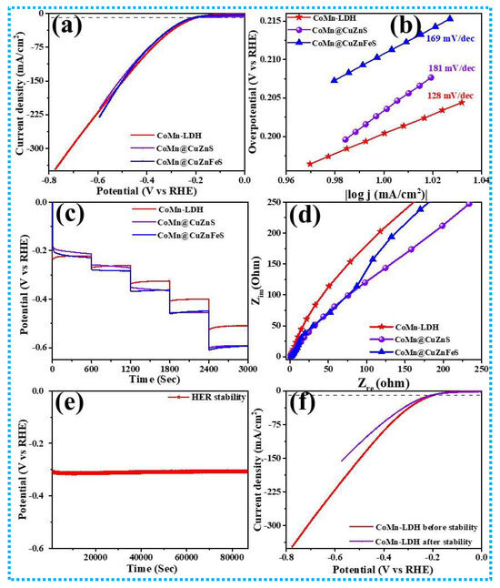 (a) HER LSV curves; (b) Tafel plots; (c) chronopotentiometric measurements of HER at different current densities; (d) Nyquist plots for CoMn-LDH, CoMn@CuZnS, and CoMn@CuZnFeS heterostructures in 1 M KOH solution; (e) chronopotentiometric stability study of CoMn-LDH; and (f) LSV curves of CoMn-LDH before and after stability testing.