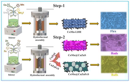The CuZnS and CuZnFeS composites were grown on CoMn-LDH base by the solvothermal technique. Copper (II) chloride dihydrate (CuCl22H2O), zinc chloride (ZnCl2), iron (III) chloride hexahydrate (FeCl36H2O), and thiourea (NH2CSNH2) (4 mM each) were distributed and continuously stirred to form a uniform solution in 50 mL of DI water. The as-prepared CoMn-LDH/NF and precursor solution were moved into a Teflon liner followed by heating at 130 °C for 2 h. The acquired samples were dried after being cleansed with DI water overnight at 60 °C. Scheme 1 displays the graphical illustration of LDH and the heterostructure growth process.