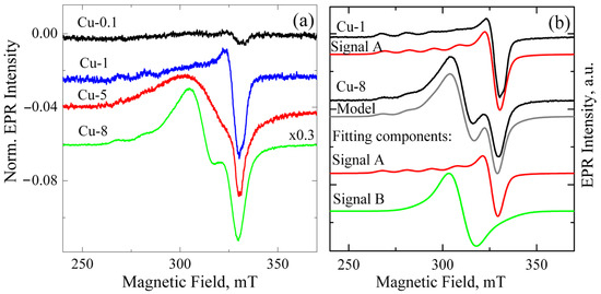 (a) EPR spectra of Cu-doped ZrO2 powders calcined at 400 °C. The Cu content varies from 0.1 to 8 mol.%. Spectra are normalized by powder mass and to the amplitude of the reference sample; (b) experimental and model EPR spectra of Cu-1 and Cu-8 powders calcined at 400 °C. Fitting components for each sample are also shown as red and green curves.