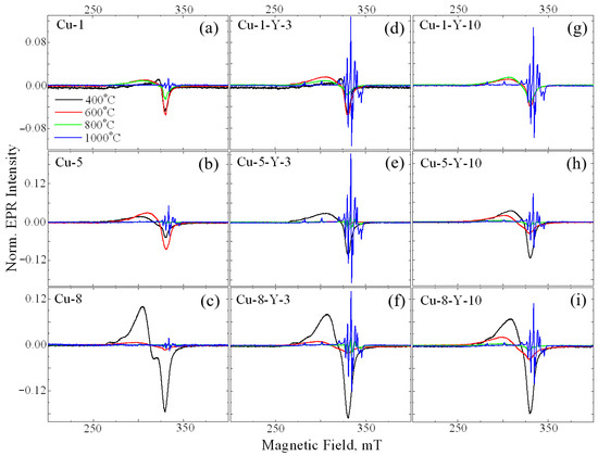 EPR spectra of Cu-doped (a–c) and (Cu,Y)-codoped (d–i) ZrO2 powders calcined at 400 (black line), 600 (red line), 800 (green line), and 1000 °C (blue line). The CuO loading is 1 mol.% (a,d,g), 5 mol.% (b,e,h) and 8 mol.% (c,f,i). The Y2O3 loading is 3 mol.% (d–f) and 10 mol.% (g–i).