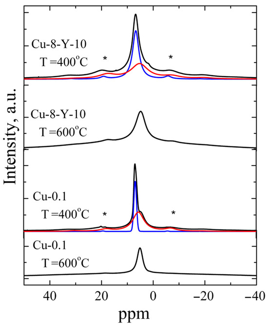 Experimental spectra 1H MAS NMR of ZrO2 powders doped with 0.1 mol.% CuO and ZrO2 powders co-doped with 8 mol.% CuO and 10 mol.% Y2O3 calcined at different temperatures (black curves) and also fitting components (red and blue curves). Asterisks mark the spinning sidebands.