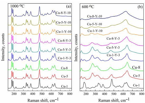 Raman shift spectra of Cu-doped and (Cu,Y)-co-doped ZrO2 powders calcined at 1000 (a) and 600 °C (b).