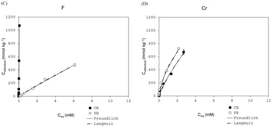 Figure 1 shows the adsorption curves obtained for the four PTEs in the two biopowders. As observed, different types of adsorption curves were obtained depending on both the PTE and the biopowder tested. Thus, according to the classification proposed by Giles et al. (1974) [39], Giles Type-L curves were obtained for the adsorption of P in PB (Figure 1A), for the adsorption of As in PB (Figure 1B), and for the adsorption of Cr in both biopowders (CB and PB) (Figure 1D). On the other hand, Giles Type-C curves were obtained for the adsorption of As in CB (Figure 1B) and for F in both biopowders (Figure 1C), while a Giles Type-S curve was obtained for the adsorption of P in PB (Figure 1A).