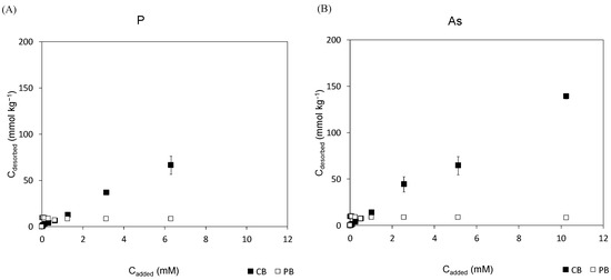 In the case of CB, desorption was slightly higher than in PB for P and As, although it did not exceed 150 mmol/kg (specifically 66.4 and 168.8 mmol/kg, respectively). On the other hand, desorption was higher in PB than in CB for F and Cr, reaching 28.1 and 77.5 mmol/kg, respectively.