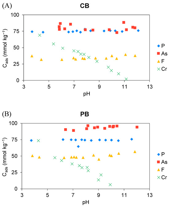 The effect of the pH solution on PTE adsorption by the two biopowders is shown in Figure 3. As can be seen in Figure 3A, P and F adsorption is less affected by pH, resulting in almost constant adsorption on CB in the studied range, especially for P. Fluoride showed a slight increase in adsorption with increasing pH, although this was not significant, with the lowest adsorption at pH ≈ 4. Regarding As, the highest adsorption on CB was obtained at pH 11, followed by pH 6 and 7. Although differences with other pHs were not huge, adsorption concentrations were >72 mmol/kg in all cases. Contrarily, Cr adsorption showed a clear dependence on pH regarding its adsorption on CB, being higher at acidic pH and tending to decrease with increasing pH. In the studied range of pH, higher adsorption on CB was obtained for As > P > Cr > F.