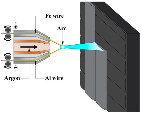 Studies on the production of intermetallic phases in situ by the arc method are known from the literature [23]. Shen et al. [24] obtained iron aluminide in the additive manufacturing process by simultaneously melting two wires of Al and Fe using the TIG method. In turn, by melting wires of Fe and Ni in an electric arc, intermetallic phases of the Fe-Ni system were produced [25]. In this way, phases of the Fe3Al and Fe-Ni systems were obtained, respectively, at a lower cost compared to traditional powder metallurgy processing. The arc spraying method is rarely used due to the limited possibility of applying coating material in the form of ready-made Fe-Al intermetallics. However, in the work [26], intermetallic phases were produced using this method through the simultaneous melting of two different wires of Fe and Al. FexAly phases are created during spraying or after spraying during additional heat treatment [27]. An obstacle to the synthesis of intermetallic phases in the coating may be the oxide phase formed during spraying in an air atmosphere [24]. Therefore, the main purpose of this article is to perform the arc spraying of a Fe-Al coating in a chemically inert gas environment of argon and to describe the impact of the argon shield on the properties of the coating compared to a coating sprayed in an air atmosphere.
