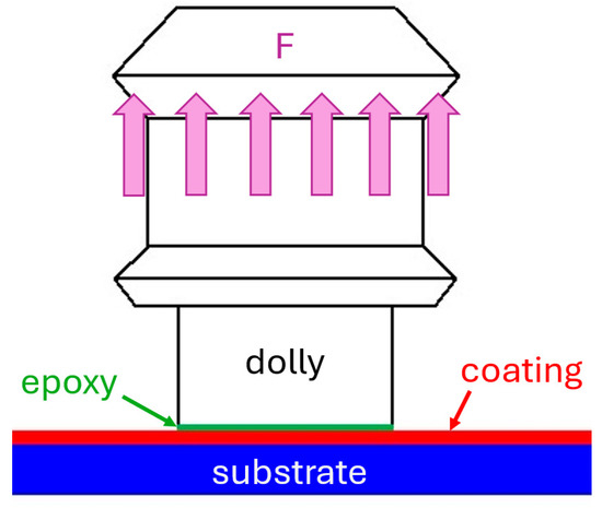 An Elcometer 510 automatic pull-off adhesion gauge (Elcometer, Manchester, UK)was used to measure the adhesive strength of the Fe-Al coatings on the steel substrate. During the tests, dollies with a diameter of 10 mm were used, providing a measuring range of 8 to 100 MPa. The device employs the pull-off method, in which the dollies were glued to the unprocessed sprayed coating with epoxy-based adhesive. The diagram of the test with the designation of the individual layers of the sample is shown in Figure 2. The pull rate was applied at 0.8 MPa/s. After the adhesion tests, to determine the nature of the failure, observations were made using an Olympus SZ61 stereoscopic microscope (Olympus, Hamburg, Germany).