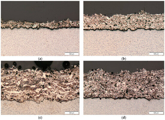 Figure 3 shows the macrostructures of arc-sprayed Fe-Al coatings using Ar (Figure 3a–c) and air (Figure 3d) as the spraying gasses. Moreover, the samples sprayed in argon were applied as single-stage (Figure 3a), double-stage (Figure 3b), and three-stage (Figure 3c) coatings. The macrostructures presented in Figure 3 exhibit variable layer thicknesses. The results of these tests are presented in Table 4, which shows average values from five measurements. The porosity of each coating was determined from five areas covering the entire thickness of the coating, and the average of these measurements was then calculated (Table 4). In the Fe-Al coatings sprayed in argon, the porosity remained at a similar level, approximately 10%. This indicates consistent conditions during the spraying process. In contrast, in the coating sprayed with compressed air, the porosity value was slightly higher, fluctuating around 12%.
