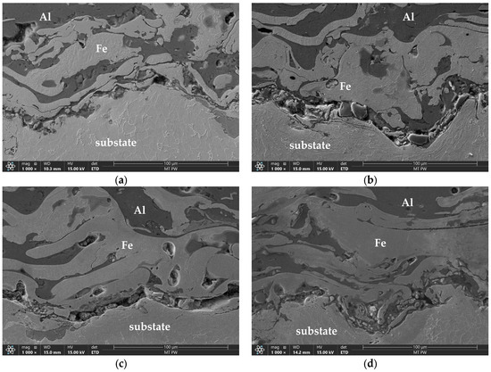 Observations carried out at higher magnification revealed the microstructure of the coatings (Figure 4). This structure is layered, with a clear dominance of two phases: dark and light. These phases are evenly distributed (Figure 4a). Pores (black areas), both small and large, spherical and elongated, are also visible. Moreover, against the background of the light phase, slightly darker elongated precipitates of the newly formed phase are visible (Figure 4b). It can be assumed that these are solid solutions of Al in Fe or intermetallic phases formed in situ from these elements. More detailed microstructure studies were conducted using scanning electron microscopy. Figure 5 shows the coating–substrate interface. In each of the tested samples, this boundary is continuous. However, a more refined microstructure was observed in the layer at the boundary with the steel substrate than in the interior of the coating. Occasionally, the small phases located at the substrate-coating interface had shapes close to spherical. This suggests the rapid crystallization of the coating material upon contact with the substrate material. The fast crystallization is most likely caused by the expanding argon. As a result, the falling particles of the filler material crystallize faster and do not flatten out. For the same reason, pores form near the boundary with the substrate (Figure 5a–c). In contrast, in the coatings sprayed with compressed air, although a fine structure was also observed near the boundary with the substrate, the melted particles are flattened and well-adapted to the steel surface, resulting in the absence of pores (Figure 5d).