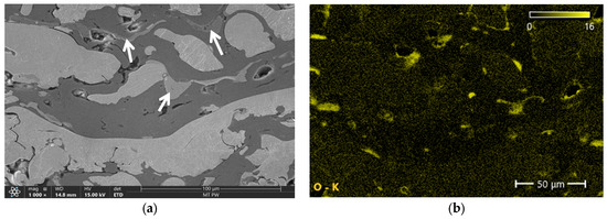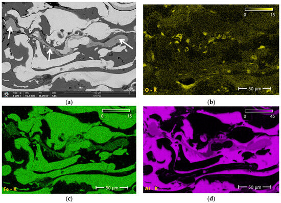 Figure 6, Figure 7, Figure 8 and Figure 9 show the microstructures of Fe-Al coatings from the zone located in the middle of the layer thickness and the surface distributions of oxygen, iron, and aluminium. The microstructures are clearly dominated by two phases, light and dark. The surface distribution of elements shows that the light phase is iron and the dark phase is aluminium. In addition to these two phases, a third phase with an intermediate grey colour is also visible, indicated by white arrows in the microscopic images. Both iron and aluminium are present in these areas.