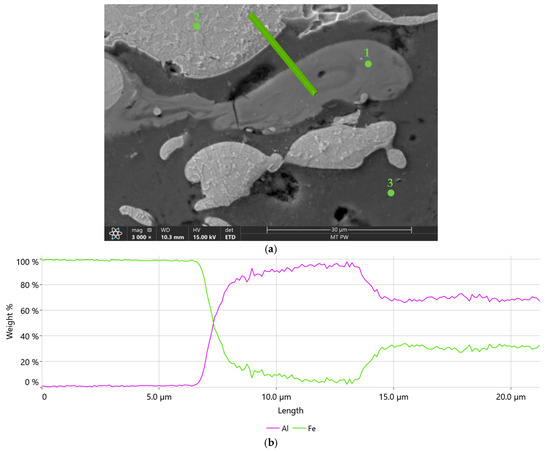 Figure 10 shows an example microstructure of the 1Ar coating with a newly formed phase at a higher magnification and the distribution of aluminium and iron concentrations along the analyzed line passing through all the components of the microstructure. These studies confirm that in the matrix composed of aluminium and iron layers there is a grey phase that contains both Fe and Al. It is also clearly visible that the concentration of aluminium in this in situ formed phase is higher than that of iron. This is confirmed by the results of point analysis in three characteristic phases of the coating (Table 5). Taking into account the mutual proportions of iron and aluminium in point 1, in accordance with the Fe-Al phase equilibrium system [30], it can be concluded with high probability that in this area, the intermetallic FeAl3 phase was formed in situ during the spraying process. Table 6 presents the chemical compositions of the Fe-Al system phases formed in situ, in the areas marked with white arrows in Figure 7a, Figure 8a, and Figure 9a. The mutual proportions of the components indicate that the FeAl + FeAl2 phases (2Ar coating), FeAl2 phase (3Ar coating), and Fe2Al5 phase (3Air coating) were formed, respectively. According to [31], the Fe2Al5 phase forms first at high temperatures, just below the melting point of Al. This suggests that the coating sprayed in air was formed at the highest temperature. Moreover, Wang et al. [31] stated that the kinetics of FeAl3 phase growth is much slower than that of the FeAl and FeAl2 phases. This may indicate a limited volume fraction of the FeAl3 phase formed in situ. Hence, it can be concluded that the Fe2Al5 and FeAl2 phases dominate in the Fe-Al coatings. From the point of view of mechanical properties, both of these phases have high mechanical properties, as demonstrated in [32]. However, the Fe2Al5 phase has better resistance to brittle fracture and greater hardness than the FeAl2 phase.