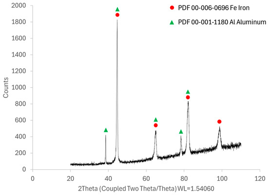 Although intermetallic phases from the Fe-Al system were formed in the sprayed coatings, their share is small. The quantitative analysis of the intermetallic phases showed that for the coatings sprayed in air, the volume fraction of intermetallic phases was about 3%, while for the coatings sprayed in argon it was, on average, about 0.7%. In addition, the identified FeAl, FeAl2, FeAl3, and Fe2Al5 phases occur simultaneously in individual coatings. Therefore, the share of a specific phase in the analyzed coating is much lower than the aforementioned value. It is known that the intensity of the diffraction signal in the XRD method depends mainly on the volume fraction of the phases. In this case, the share of intermetallic phases is below the detection threshold in XRD. Due to this, even in the diffraction pattern obtained for the coating with the highest volume fraction of intermetallic phases, only peaks originating from Fe and Al were observed (Figure 11). Therefore, at this stage, the identification of intermetallic phases formed in situ is mainly based on SEM EDS studies.