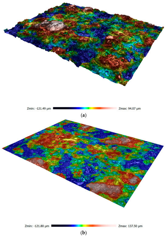 After the spraying process, the obtained FeAl coatings were subjected to roughness tests using the Sensofar S Neox 3D Optical Profiler with the SensoSCAN software (1.9.2.0), utilizing active illumination focus variation technology. It is based on Sensofar’s extensive expertise in the field of combined confocal, focus variance, and interferometric 3D measurements. The uncertainty of the used measurement system (U), according to [29], for the used step height equals 0.07 µm. The roughness measurements for each sample were taken at three different locations under the following conditions: topography—1354 × 1018 pixels; area—1.75 mm × 1.31 mm; pixel size—1.29 μm/pixel; and magnification—10.00×.
