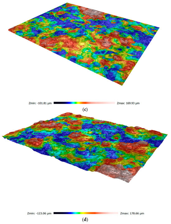 Surface roughness profile of sprayed coatings: (a) 1Ar, (b) 2Ar, (c) 3Ar, and (d) 3Air.
