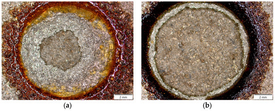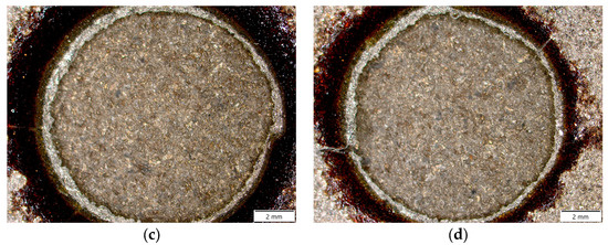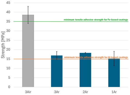 The results of the adhesion of coatings to the substrate, which are the average values of three measurements, are presented in the form of a graph in Figure 13. By far the highest strength value was recorded for the variant sprayed in air. The average strength value exceeded 35 MPa, which is the minimum value required for Fe-based coatings according to [33]. Detachments for the samples thermally sprayed in air were of a mixed failure type, including coating–substrate adhesion failure, coating cohesion failure, and epoxy failure. Cohesion failure was dominant, with approximately 50% of the dolly’s surface affected after the test (Figure 14a). The use of argon as the process gas reduced the adhesive strength values, which ranged from 15.2 to 18.3 MPa. The obtained values are below 35 MPa but exceed 15 MPa, which is the minimum value required for Al-based coatings. For the samples sprayed in argon, the failure was adhesive in nature and occurred at the interface between the coating and the substrate (Figure 14b–d). The significantly higher adhesion of Fe-Al coatings to the substrate sprayed in compressed air results from the conditions under which the coatings form. The formation of Fe-Al intermetallic phases is associated with exothermic reactions [34,35,36]. On the other hand, the presence of oxygen, in addition to the formation of oxide compounds, also leads to the release of heat. The standard value of the enthalpy of formation for Al2O3 has a much higher exothermic potential than that of Fe-Al compounds [37], which in turn causes a much greater thermal activation of the substrate. The higher temperature accompanying the formation of these coatings promotes a better fit of the molten particles to the developed surface of the base material. This, in turn, increases the adhesion of Fe-Al coatings to 16Mo3 steel.