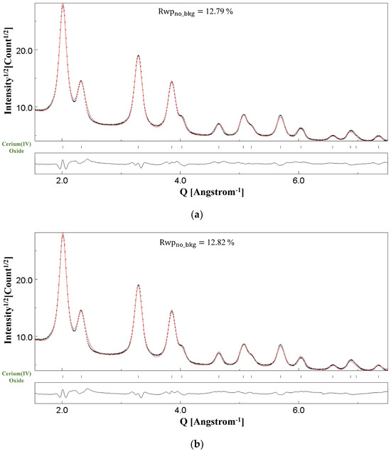 We have used NC CeO2 for the determination of the instrumental broadening function of our instrument in a previous work [12], wherein detailed microstructural evaluation has also been done using XRD. However, in this section, the point of inquiry is the difference in the Rietveld fittings under the two fitting models for Si and CeO2 samples. The consequences of the results are even more interesting, because the average crystallite size of NC CeO2 is of the order of 120 Å [12], whereas NC Si has a relatively smaller size of 30 Å [13], and it has been generally proposed in the literature that, for small-sized nanoparticles and thin films, a microstructural evaluation even under the kinematical approximation leads to reliable results [21,46].