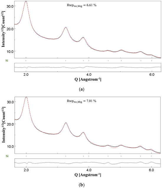 A close monitoring of the weighed sum of the squared differences (WSS) and weighed profile R-factor without background () [12], to obtain their minimum value with a minimum set of refined parameters, along with the visual inspection of the Rietveld fitting [44], were the criteria to inspect the analysis at successive refinement stages.