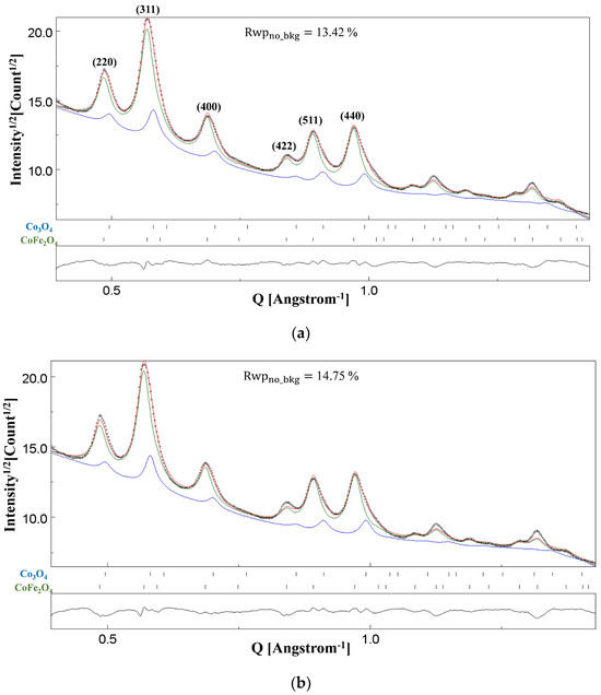 Figure 6a,b show the Rietveld fittings of the SAED pattern in Figure 5b under two-beam dynamical correction and kinematical approximation, respectively. The blue and green lines in these figures represent the calculated profiles for Co3O4 and CoFe2O4 phases, respectively. The red line is the combined calculated pattern, which is plotted against the experimental pattern (black dots). It may not be clear immediately from the visual inspection that the profile fitting in Figure 6a is better, although some indications are visible, for instance, the indexed (220) reflection having a better match between the experimental and calculated intensities. However, a lower reliability factor value, = 13.42%, as compared to a higher value of 14.75% for the fitting in Figure 6b justifies that the SAED pattern collected from such a specimen with thick agglomerates must be analysed with the implemented correction. The refined value of the thickness parameter T (Equation (1) in Section 2) was obtained as 1588(24) Å.