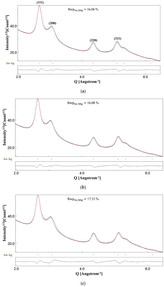 Figure 8a shows the Rietveld fitting of the SAED pattern in Figure 7b, having very broad peaks. Gold and silver have identical crystal structures—both crystallise in the fcc structure—have comparable atomic sizes and lattice parameters, and form a solid solution over the entire range of composition [51,52]. Hence, it is not possible to distinguish between an Au-Ag nanoalloy from either of the two monometallic Au and Ag phases using diffraction line broadening. This means that the position of the indexed (111), (200), (220), and (311) reflections in Figure 8a might correspond either to Au, Ag, or Au-Ag alloy. However, the formation of the substitutional solid solution has already been established in [45], and hence, we determined the lattice parameter of this nanoalloy as a function of Au composition. The technique adopted for this sample was similar to that for NC CoFe2O4, and the lattice parameter of the nanoalloy was determined as , where 4.07825 Å is the unrefined lattice parameter of Au, 4.0862 Å is the unrefined lattice parameter of Ag, and X is the refined Au occupancy in the nanoalloy. These values, along with the anisotropic crystallite sizes, are given in Table 6 for the Rietveld refinement shown in Figure 8a, with the Blackman correction implemented. The refined values of the r.m.s. microstrain parameter were negligible and hence set to zero. The CIF files used for the Rietveld refinement correspond to card numbers 9008463 and 9008459 of the Crystallographic Open Database (COD) [53] for Au and Ag, respectively. The atomic occupancy of Au in the nanoalloy determined at the final stage of the refinement routine was 0.91(7).