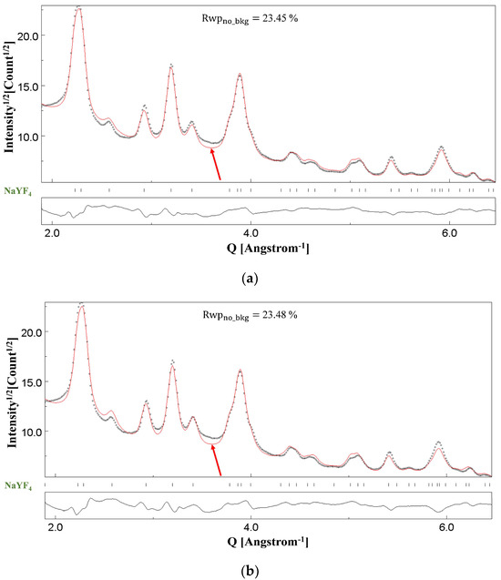 The effect of the amorphous carbonaceous thin film seen in Figure 9c is like that of the supporting film on the TEM grids, discussed already in our previous paper [12]. For NC NaYF4, the diffused contribution from the thin film regions seen in Figure 9c has not been accounted for, and hence, its effect on the Rietveld fitting can be seen (see arrows in Figure 10).