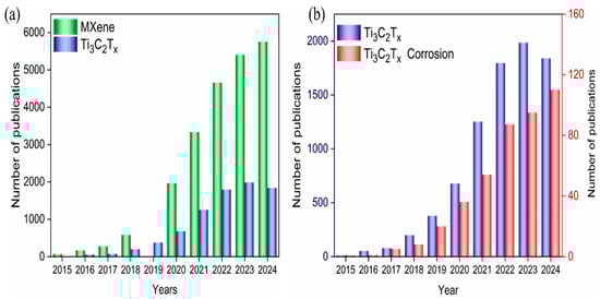 Annual publication of papers on MXene, Ti3C2Tx, or “Ti3C2Tx and Corrosion” as a topic over the past decade: (a) MXene and Ti3C2Tx, (b) Ti3C2Tx and “Ti3C2Tx and Corrosion”. Source: Web of Science Search index: [topic = MXene or Ti3C2Tx or “Ti3C2Tx and Corrosion”].