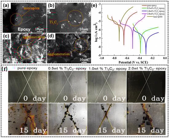 SEM images of surface morphology of MXene/epoxy coating with different Ti3C2Tx content: (a) bare EP, (b) 0.5 wt.% Ti3C2Tx/EP, (c) 1.0 wt.% Ti3C2Tx/EP, (d) 2.0 wt.% Ti3C2Tx/EP; (e) the polarization curves of uncoated and coated Ti3C2Tx/EP samples after 96 h of immersion in 3.5% NaCl, (f) photographs of four kinds of coating samples before and after the 15-day salt spray test [30]. Reprinted with permission from [30], copyright 2019, Elsevier.