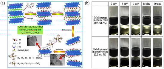 Preparation and stability of amino-functionalized Ti3C2Tx [74]. (a) Schematic illustration of synthesis and surface APTES-functionalized Ti3C2Tx, (b) settlement of 0.5 wt.% l-M and f-M dispersed in EP after 0–30 days of static placement. Reprinted with permission from [74], copyright 2020 Elsevier.