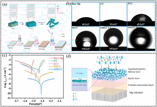 Preparation and performance of functionalized superhydrophobic Ti3C2Tx/epoxy/cerium conversion (STECC) composite coating [82]. (a) Fabrication process of STECC composite coating on the surface of Mg alloy; (b) The WCA of the bare Mg alloy, CC, ECC, TECC, STECC coating, and SA of the STECC coating; (c) The polarization curves of as-fabricated specimens after 1 day of immersion in 3.5 wt.% NaCl solution; (d) Schematic diagram of the STECC coating corrosion-protection mechanism. Reprinted with permission from [82], copyright 2023, John Wiley and Sons.