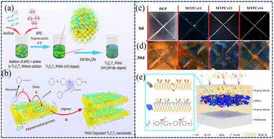 Schematic illustration of the preparation of Ti3C2/PANI composites [86]. (a) Preparation of Ti3C2 NSs. (b) Synthesis of Ti3C2/PANI composites (TPCs) with the mechanism of oxidative polymerization of aniline on Ti3C2. (c,d) Photograph of the samples before and after the salt spray test for 30 days. (e) Diagram explaining the corrosion-resistant mechanism of multilayer thin polymer coatings (MTPCs). Reprinted with permission from [86], copyright 2021, Elsevier.