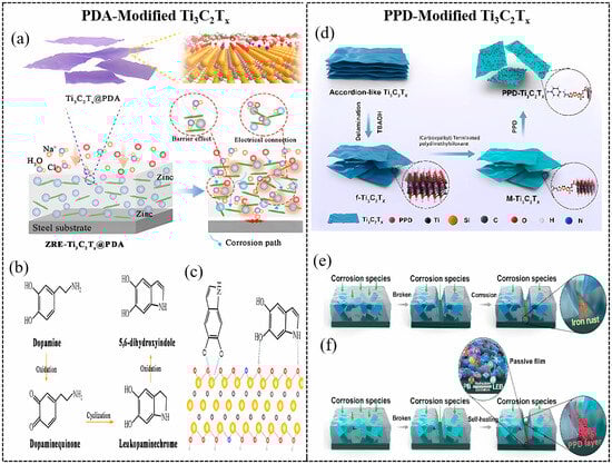 (a) The schematic anticorrosion mechanisms of ZRE-Ti3C2Tx @PDA/WEP coating; the mechanisms of (b) polymerization of dopamine and (c) binding on Ti3C2Tx NSs [96]. Reprinted with permission from [96], copyright 2023 Elsevier. (d) The synthesis process for PPD@Ti3C2Tx hybrids. Schematic representation of anticorrosion and self-healing protection mechanism of (e) 0.5f-Ti3C2Tx/EP, (f) 0.5PPD@Ti3C2Tx/EP [97]. Reprinted with permission from [97], copyright 2023 Elsevier.